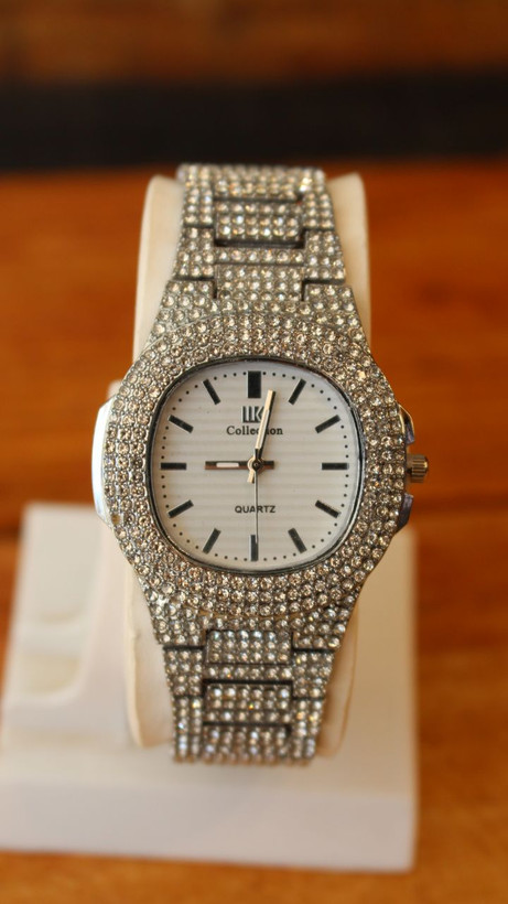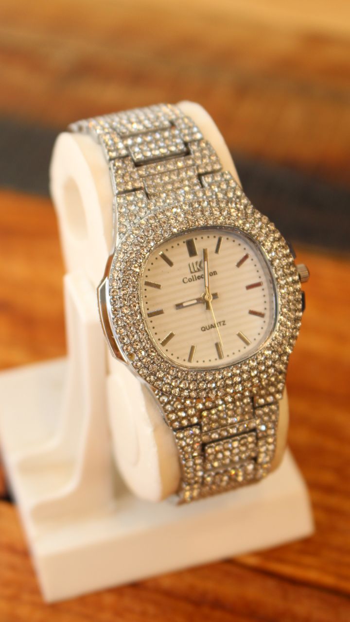 این ساعت نقرهای کریستالی، فقط یک ساعت نیست؛ یک قطعه جواهر لوکس روی مچ دست است. درخشش خیرهکننده نگینها در کنار صفحه سفید مینیمال، حس ظرافت، اشرافیت و خاصبودن را در همان نگاه اول منتقل میکند. ساعتی که هر بار نور به آن میخورد، نگاهها را ناخودآگاه به سمت شما میکشاند.