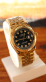 ساعتی برای کسانی که به دیده شدن عادت دارند؛ ترکیب طلای درخشان، صفحه مشکی عمیق و نگینهایی که وقار را فریاد میزنند.